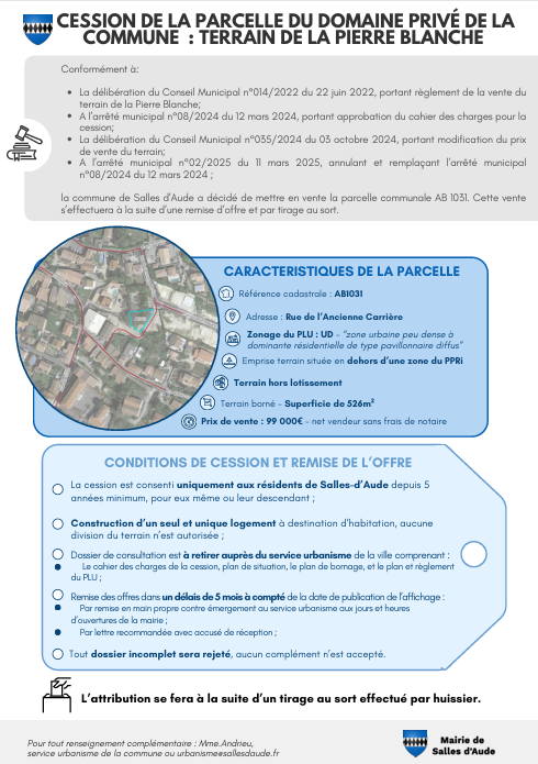 Cession de la Parcelle du domaine privé de la Commune : Terrain de la Pierre Blanche