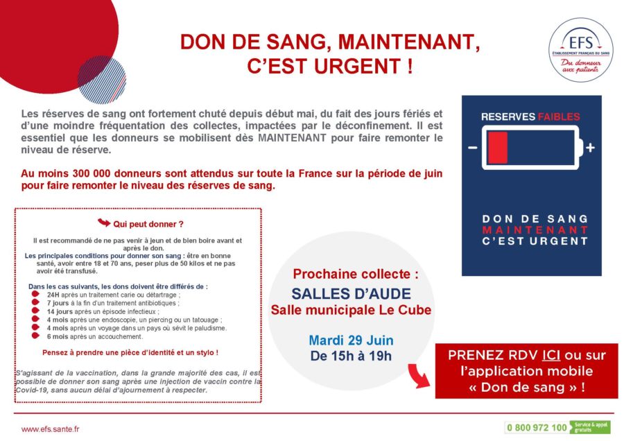 Les réserves sont faibles ! Prenez RDV pour donner votre sang à Salles d’Aude, le mardi 29 juin à la Salle municipale Le Cube de 15h à 19h : https://mon-rdv-dondesang.efs.sante.fr/ ou sur l’Application mobile « Don de sang »